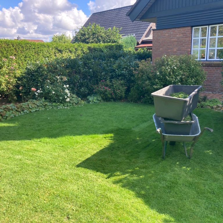 Wir übernehmen für Sie die Rasenpflege und entsorgen den Rasenschnitt, düngen und vertikutieren für Sie.